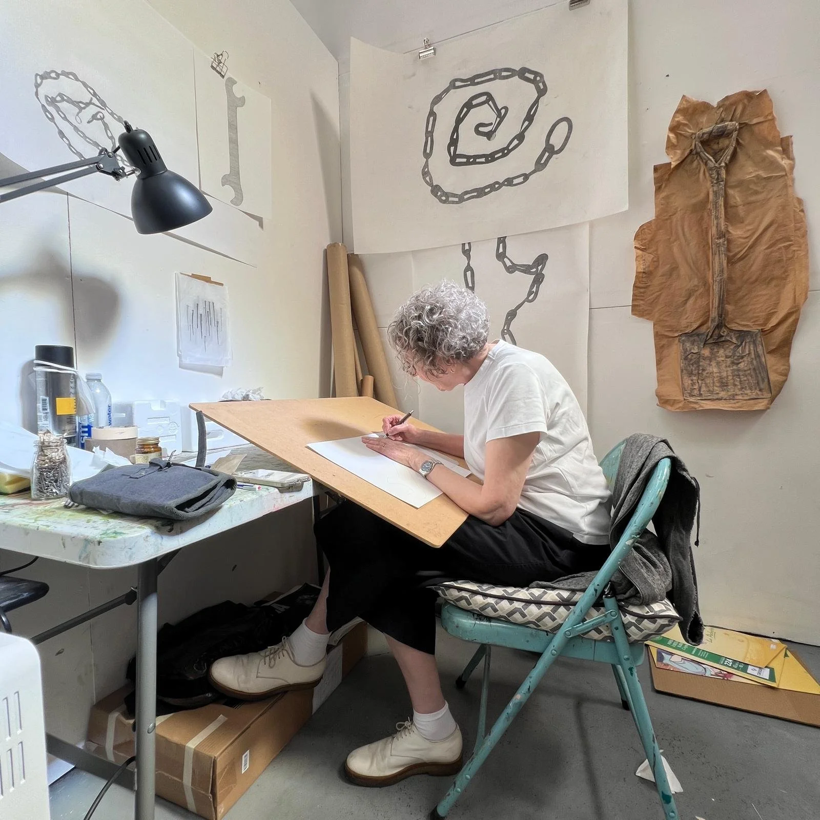 Polly: I’ve been mark-making in this way for a long time, often when I’m at a loss, a bit depressed. At its most basic, when I don’t know what I know about anything, I can find my way around an object with a pencil then fill that outline putting one line next to another. Everything else has come from that. Each line represents a different moment, and as each line follows, there’s a sense of time passing. There’s labour in digging and there’s labour in drawing. Both can make your back ache!
